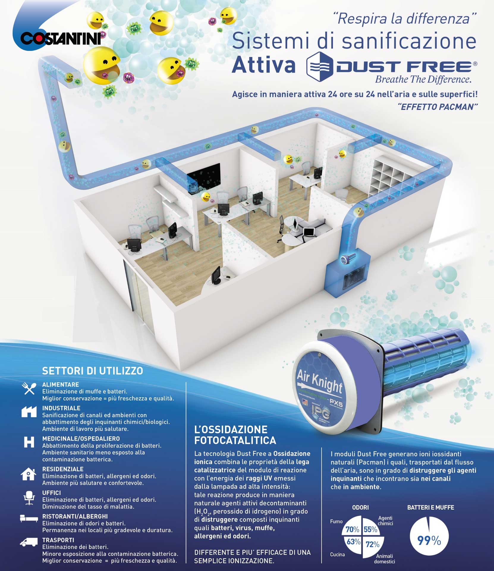 Un prodotto da noi già utilizzato che, grazie al vostro impianto di ventilazione esistente, opera un’igienizzazione continua dell’aria. I moduli DUST FREE, una volta inseriti a valle dell’UTA, nei fan-coil, o direttamente nel canale, consentono di attivare (mediante l’interazione di un catalizzatore a base di biossido di titanio e di una lampada UV ad alta intensità) una reazione fotocatalitica in grado di generare molecole di perossido d’idrogeno e radicali ossidrili. Questi, trasportati dall’impianto, sanificano in maniera ATTIVA e completa l’aria dei canali, degli ambienti e le superfici stesse abbattendo batteri, virus, muffe, allergeni ed odori.